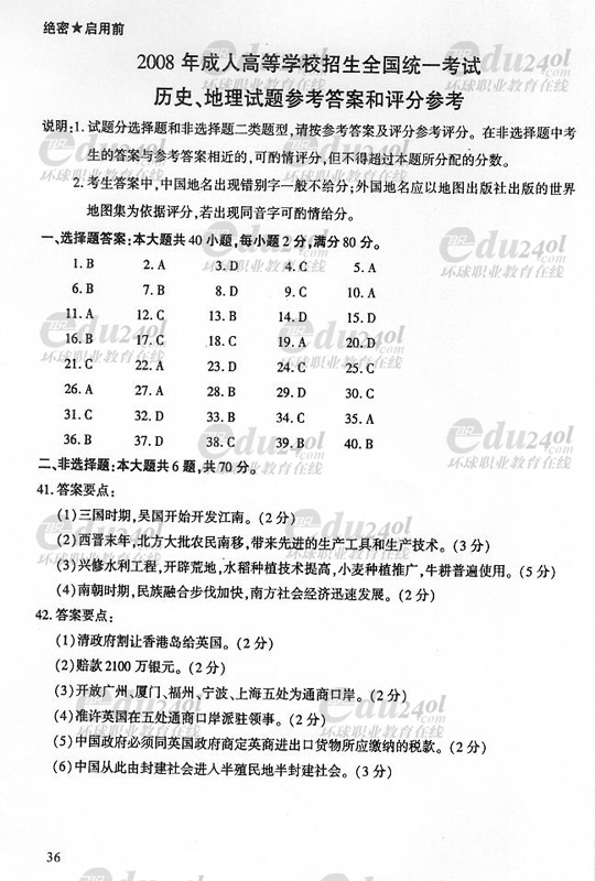 2008年成人高考高起點歷史地理答案
