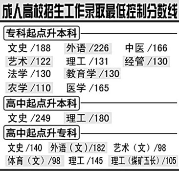 今晚,山西省招生考試管理中心公布了2008年成人高校招生工作錄取最低控制分?jǐn)?shù)線,結(jié)合我省2008年的成人招生計(jì)劃、報(bào)考人數(shù)和考生成績(jī)等情況,省招生考試管理中心劃定了2008年我省成人高校招生工作錄取最低控制分?jǐn)?shù)線。
