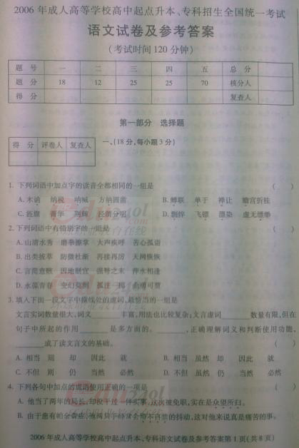 2006年成考專升本語文全國統考試卷