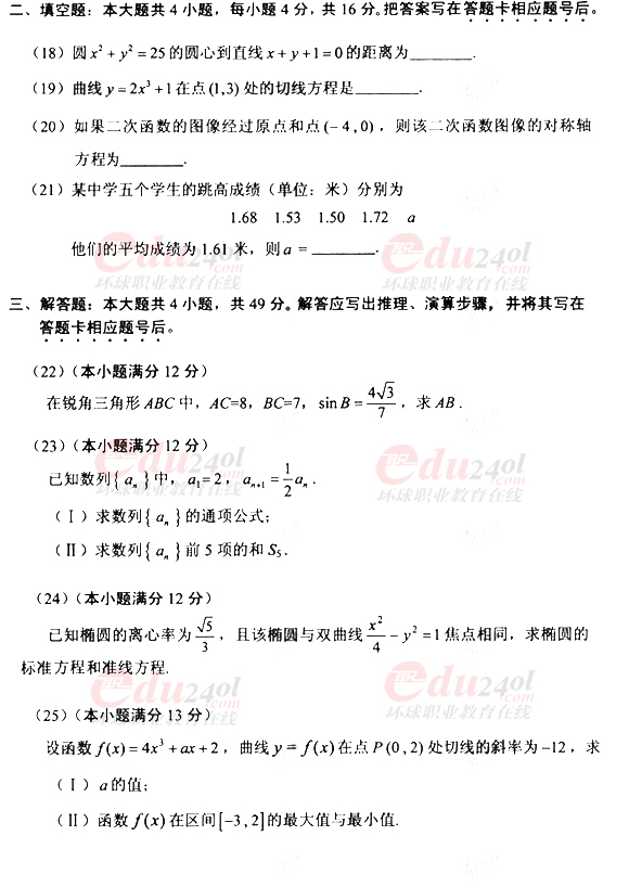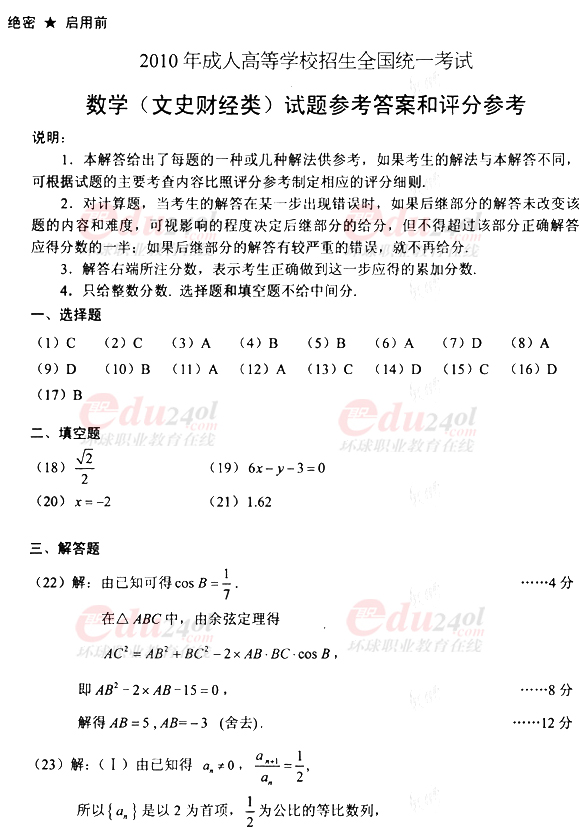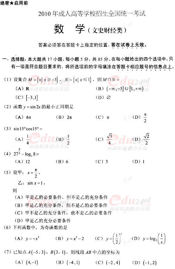當前位置: 首頁 > 成人高考 > 成人高考歷年試題 > 2010年全國成人高考高起點數學(文)真題及答案