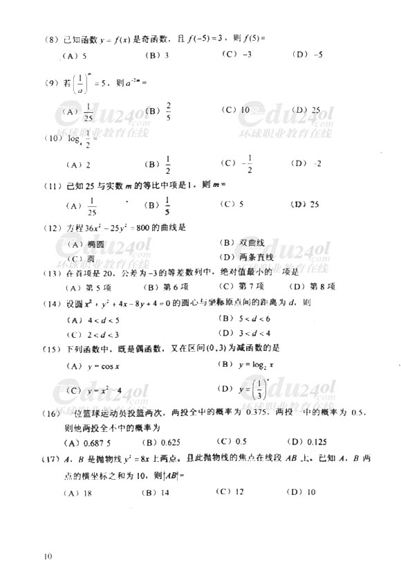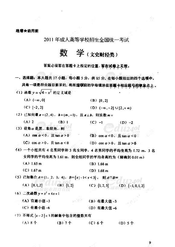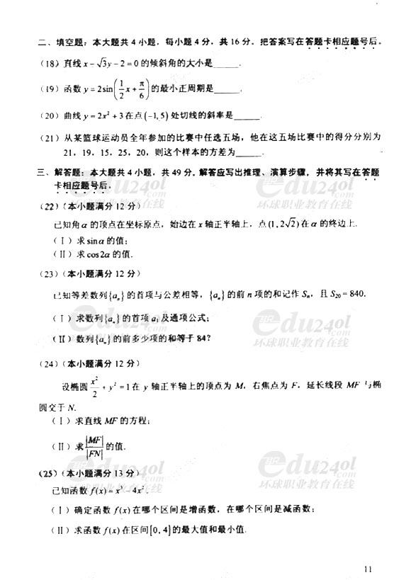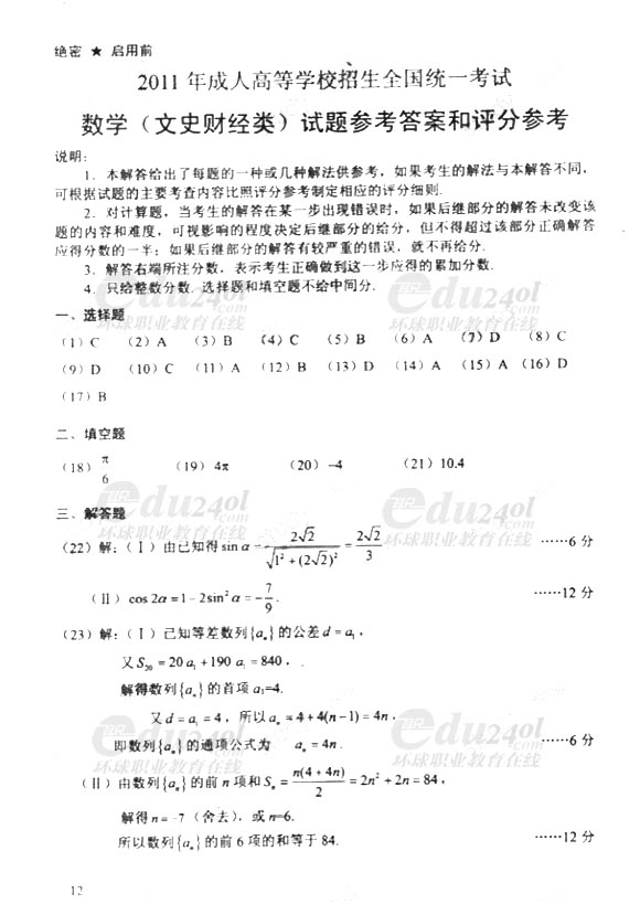 當前位置: 首頁 > 成人高考 > 成人高考歷年試題 > 2011年成人高考(高起點)數學(文)試卷及答案