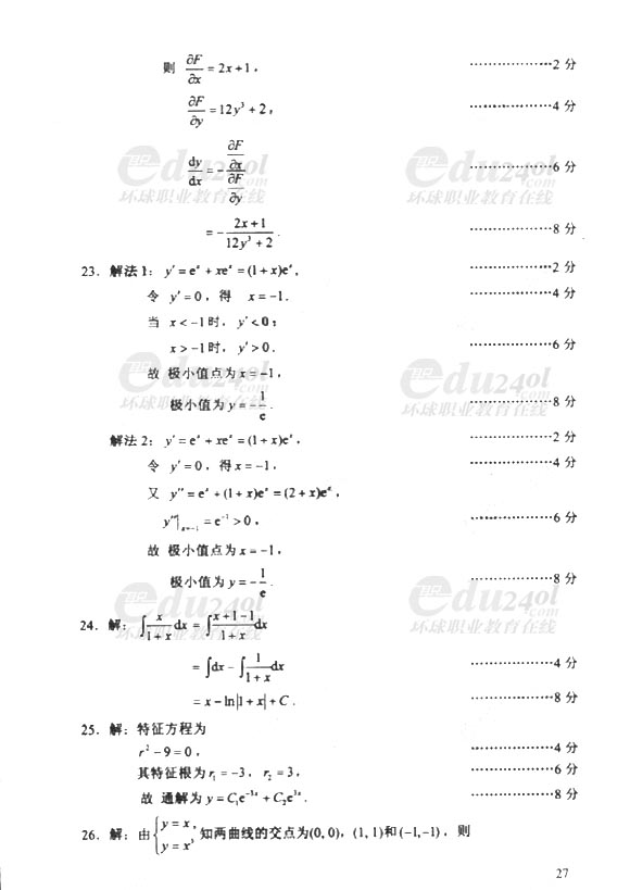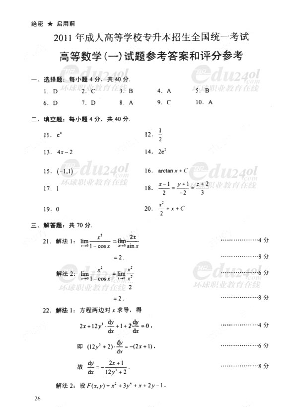 2011年成人高考(專升本)高等數學(一)試卷及答案