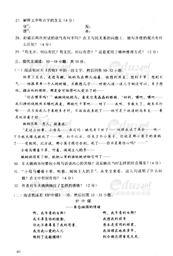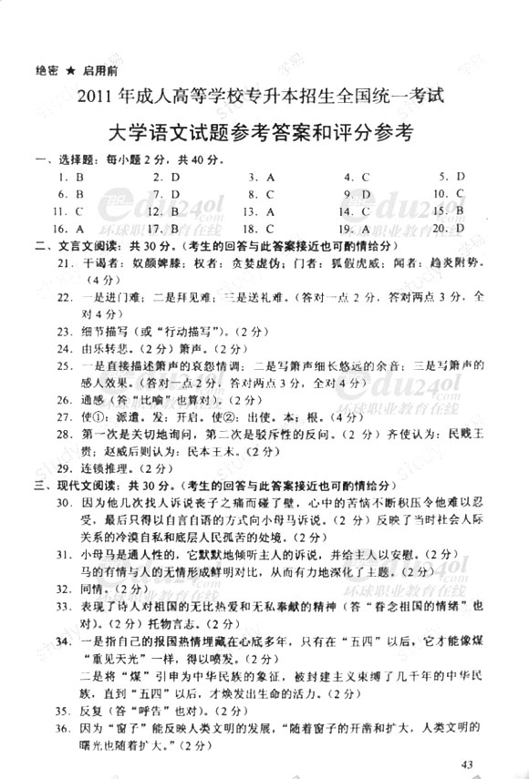 2011年成人高考(專升本)語文試卷及答案