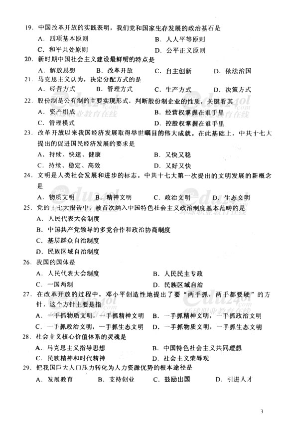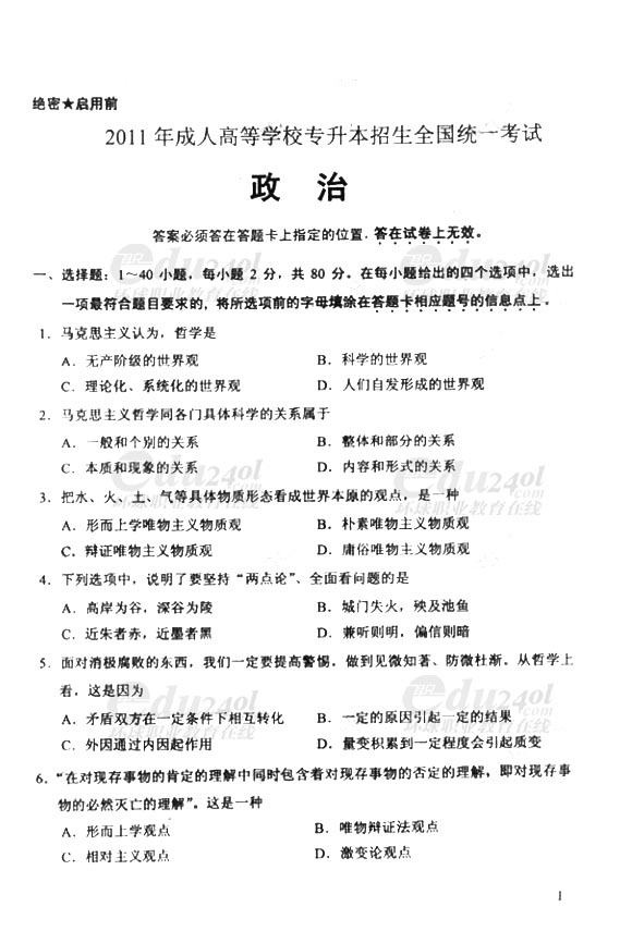 當前位置: 首頁 > 成人高考 > 成人高考歷年試題 > 2011年成人高考(專升本)政治試卷及答案
