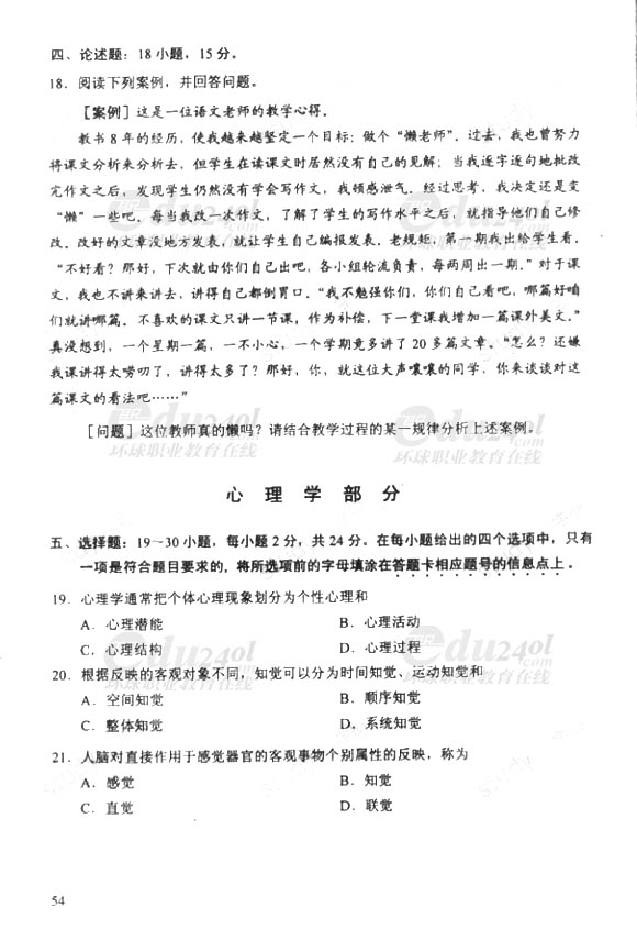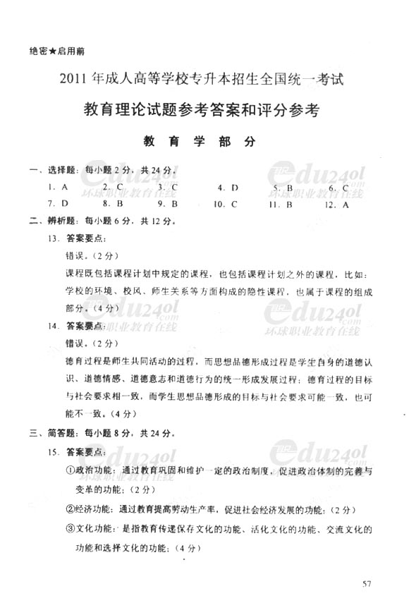 當前位置: 首頁 > 成人高考 > 成人高考歷年試題 > 2011年成人高考(專升本)教育理論試卷及答案