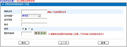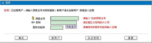 在“預(yù)報名號”以及“密碼”欄內(nèi),輸入預(yù)報名號和密碼,輸入正確的圖形校驗碼,然后單擊“確定”按鈕,進入“網(wǎng)上預(yù)報名考生全部信息”頁面,提供考生對密碼的修改功能,網(wǎng)報信息打印功能。