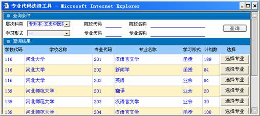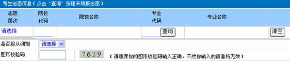 志愿填報有兩種方式:考生可以直接輸入符合條件的院校代碼和專業(yè)代碼;也可通過點擊“查詢”按鈕,使用“專業(yè)代碼選擇工具”來填報志愿,單擊已選定專業(yè)行的“選擇專業(yè)”按鈕,即可。