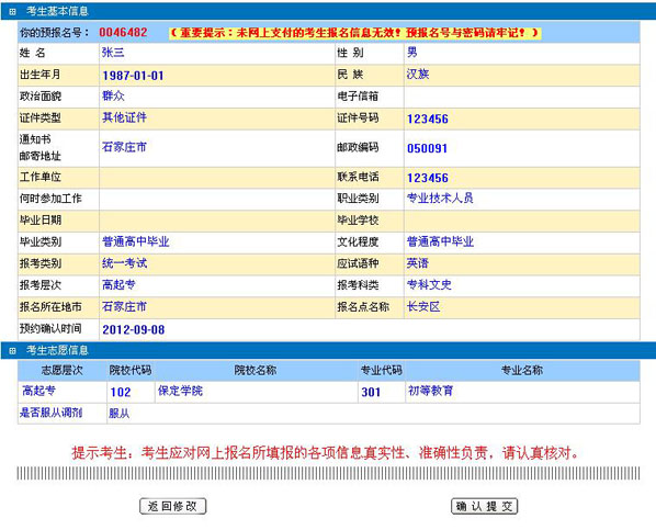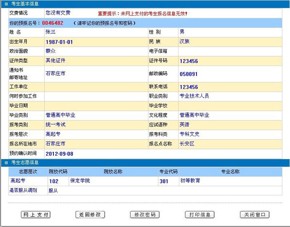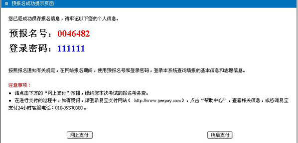或點擊“稍后支付”,進入“網(wǎng)上預(yù)報名考生全部信息”頁面,查看或修改除“報考層次”以外的其他信息,同時提供網(wǎng)上支付功能。