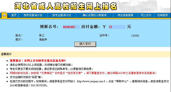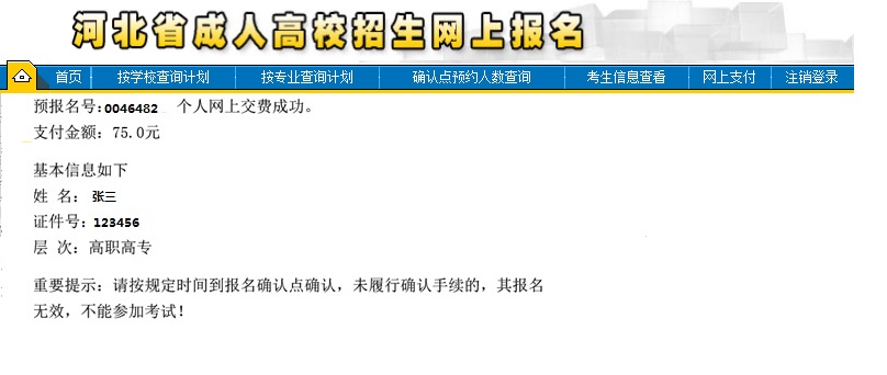 2.2013年河北省成人高校招生報名考務(wù)費全部實行考生個人網(wǎng)上支付,考生在網(wǎng)上報名時應(yīng)持有系統(tǒng)支持的“已開通網(wǎng)上支付功能的銀行卡”;未在網(wǎng)上支付報名考務(wù)費的考生不能進行報名信息現(xiàn)場確認。未進行報名信息現(xiàn)場確認的,其報名信息無效。