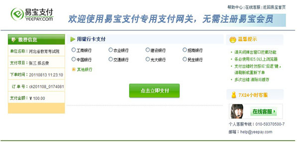 4、考生點擊“網(wǎng)上支付”按鈕,進入支付頁面,按照頁面的提示和要求完成網(wǎng)上支付報名費工作(網(wǎng)上支付完成后仍可修改除“報考層次”以外的其他信息)。若有網(wǎng)銀支付等相關(guān)問題,可咨詢易寶支付24小時客服電話:010-59370500。