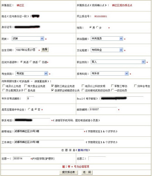 Ø 所有項都為必填項,且同一證件號碼(身份證或者軍官證)在同一地市只能報名一次。