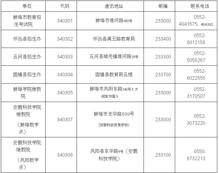 摘要 安徽蚌埠市2014年成人高考現場確認點