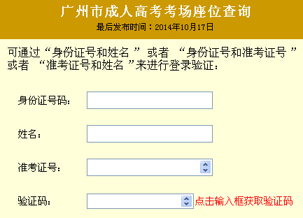 點擊下面圖片進入廣東廣州市2014年成人高考考場座位查詢入口》》