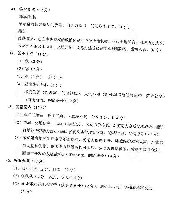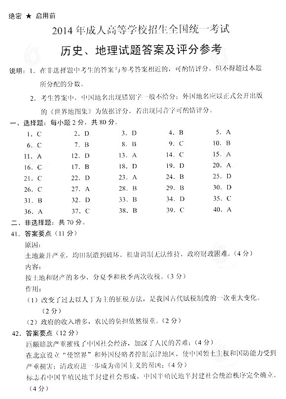 2014年成人高考高起點史地真題答案
