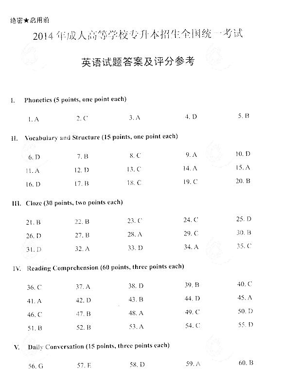 摘要 2014年成人高考專升本英語真題答案,環球網校為您提供!