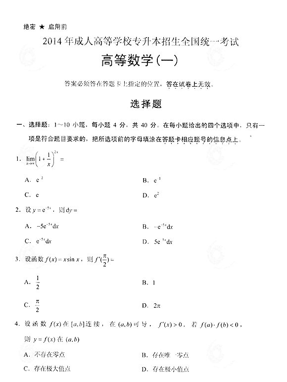 摘要 2014年成人高考專升本高數(shù)(一)真題,環(huán)球網(wǎng)校為您提供!