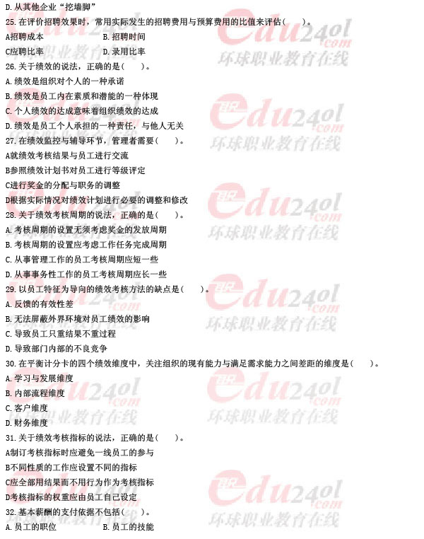 2011年經濟師考試《初級人力資源》真題及答案(4)