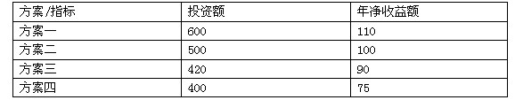 40.某企業運用透析投資回收期法進行技術改造項目決策,該項目有四個互斥方案,各方案的投資額和年凈收益額如下表所示。