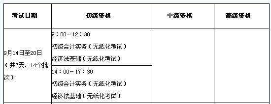 初級(jí)會(huì)計(jì)職稱無紙化考試于9月14-20日舉行;各級(jí)別、各科目具體考試時(shí)間及批次如下: