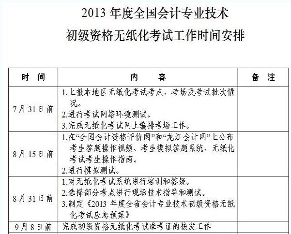 摘要 2013年初級會計職稱無紙化考試時間安排表