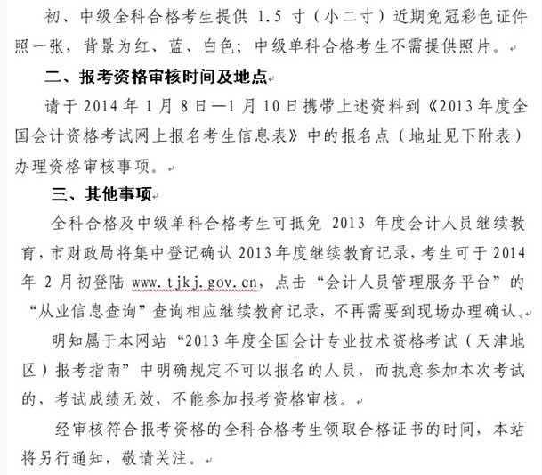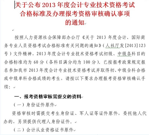 天津2013初級會計職稱考試合格標準及辦理報考資格審核確認通知
