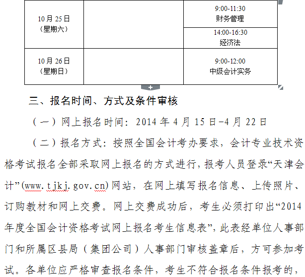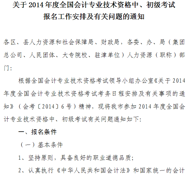 天津2014年初級會計職稱報名時間4月15日-4月22日