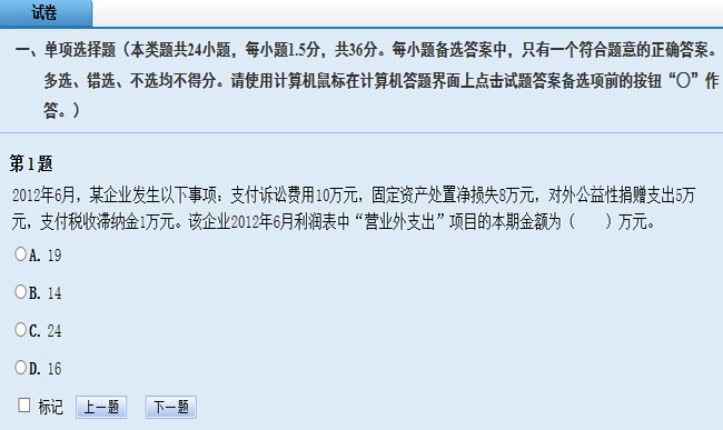 (1)本類題共X小題,每小題X分,共X分。每小題備選答案中,只有一個符合題意的正確答案。多選、錯選、不選均不得分。請使用計算機鼠標在計算機答題界面上點擊試題答案備選項前的按鈕“○”作答。