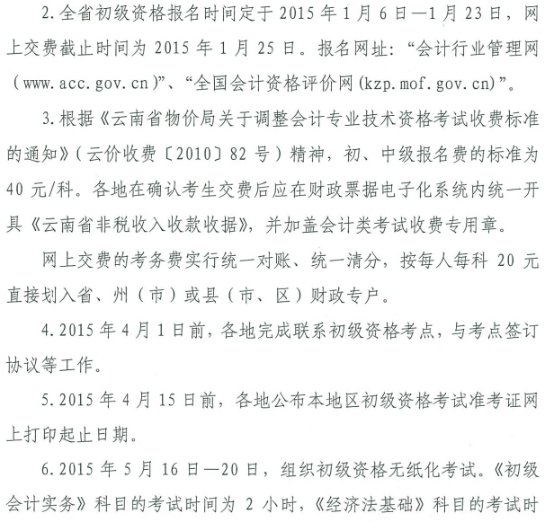 摘要 云南省2015年初級會計職稱考試考務日程安排的通知,報名時間定于1月6日-23日,網上繳費截止時間為1月25日,報名網址:“全國會計資格評價網”