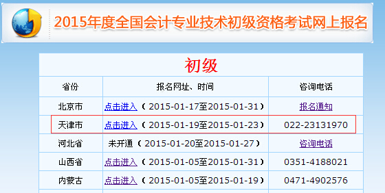 天津2015年初級會計職稱報名入口已開通,網上報名時間:2015年1月19至23日。報名方式:按照全國會計考辦要求,會計專業技術資格考試報名全部采取網上報名的方式進行,報考人員登錄“天津會計”(www.tjkj.gov.cn)網站,在網上填寫報名信息、上傳照片和網上交費。考生必須打印出報名回執方可證明報名成功。報名成功后考生必須打印出“2015年度全國會計專業技術初初級資格考試網上報名考生信息表“后留存,以備考試合格后審核資格使用。