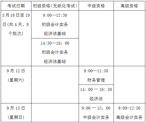 全國會計專業技術資格初、中、高級各級別、各科目具體考試時間及批次如下:(圖表一)