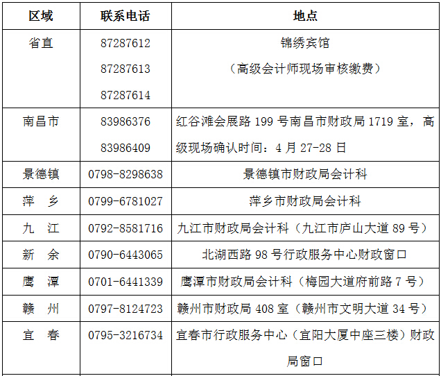 報名參加會計專業技術資格考試時,登陸江西省財政廳綜合信息網(http://www.jxf.gov.cn)或江西會計網(http://acc.jxf.gov.cn)會計專業技術資格考試報名入口,根據相應級別報名條件規定,填寫報考人員登記表,上傳照片,照片審核通過后,初、中級會計專業資格網上支付報名費,并在網上訂書及繳付訂書款,報名成功后打印報名信息表和報名回執表。報名成功的考生如需開具發票,在報名結束后到現場報名點領取,具體時間以各地財政局公告為準。高級會計師資格報名考生,在4月27-28日,攜帶網上打印的考生報名信息表、會計從業資格證、學歷證書、會計中級資格證書、單位中級專業技術職務聘書、身份證、學歷查詢認證證明(需加蓋公章,有關要求見后文)等材料原件及復印件前往現場報名點進行報名資格審查、交費,F場報名點見圖表二。