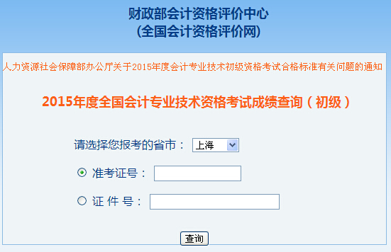 上海2015年初級會計職稱成績查詢入口
