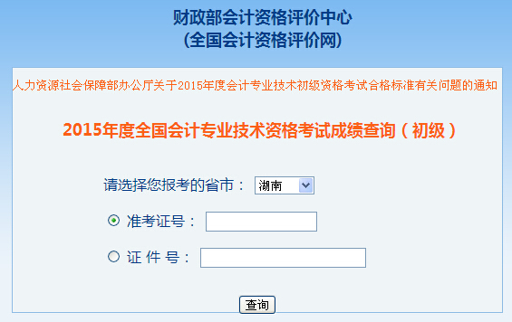 摘要 湖南2015年初級會計職稱成績查詢入口 查詢網址:全國會計資格評價網http://kzp.mof.gov.cn/cjcx/cjcx1_n.jsp