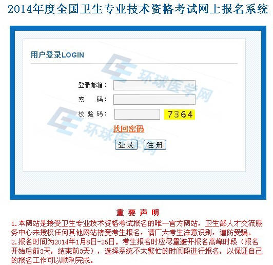 環(huán)球網(wǎng)校醫(yī)學考試網(wǎng)根據(jù)中國衛(wèi)生人才網(wǎng)初級藥師頻道的最新資訊獲悉,2014年中國衛(wèi)生人才網(wǎng)初級藥師專業(yè)技術資格考試網(wǎng)上官方報名入口已開通。環(huán)球網(wǎng)校醫(yī)學考試網(wǎng)執(zhí)業(yè)藥師資格考試頻道第一時間為大家發(fā)布2014年初級藥師專業(yè)技術資格考試網(wǎng)上官方報名入口。請考生登錄中國衛(wèi)生人才網(wǎng),進入“考生入口”欄目中的“網(wǎng)上報名”專區(qū),點擊“2014年度全國衛(wèi)生專業(yè)技術資格考試網(wǎng)上報名入口”,按要求進行用戶注冊,填寫登錄郵箱、設置登錄密碼、輸入校驗碼后進入報名界面。