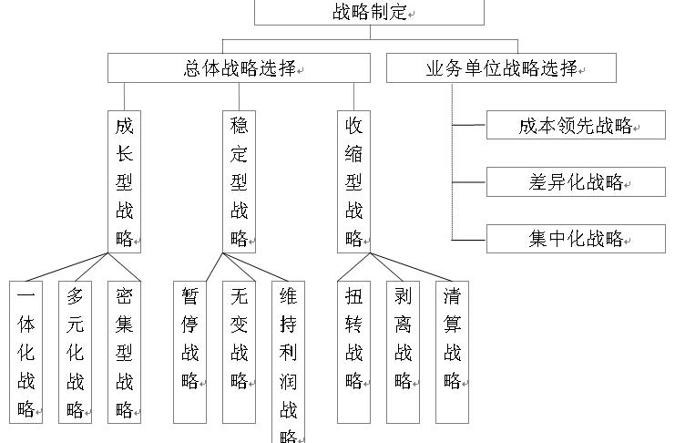 公司層面的戰略選擇包括成長型戰略、穩定型戰略和收縮型戰略。成長型戰略是以擴張經營范圍或規模為導向的戰略,包括一體化戰略、多元化戰略和密集型戰略。穩定型戰略是以鞏固現有經營范圍和規模為導向的戰略,包括暫停戰略、無變戰略和維持利潤戰略;收縮型戰略是以縮小經營范圍或規模為導向的戰略,包括扭轉戰略、剝離戰略和清算戰略。