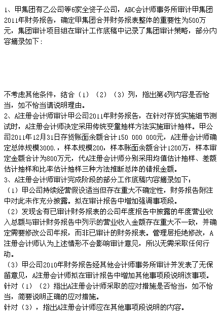 甲公司是ABC會(huì)計(jì)師事務(wù)所常年審計(jì)客戶,主要從事a,b,c石化產(chǎn)品的生產(chǎn)和銷(xiāo)售,A注冊(cè)會(huì)計(jì)師負(fù)責(zé)審計(jì)甲公司2011年財(cái)務(wù)報(bào)告,按稅前利潤(rùn)5%確定財(cái)務(wù)報(bào)表整體的重要性為60萬(wàn)。轉(zhuǎn)自環(huán) 球 網(wǎng) 校edu24ol.com