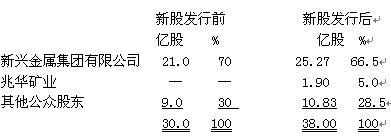 新興鋼鐵按照相關證券法規,以每股人民幣2.5元的價格向兆華礦業定向發行1.9億股普通股,并以相同價格向現有股東配售6.1億股普通股。新股發行前后的股份變動如下: