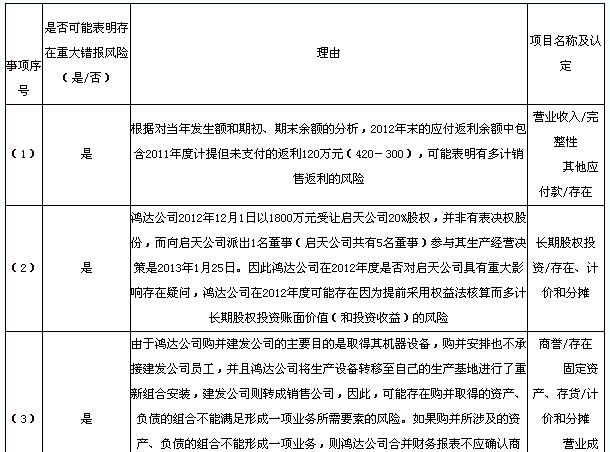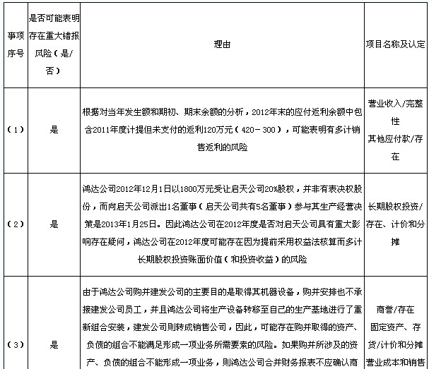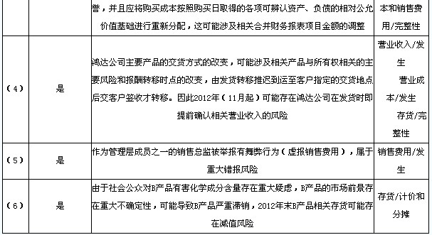 (2)根據以往年度審計結果,鴻達公司針對主要業務流程(包括銷售與收款、采購與付款以及生產與存貨)的內部控制是有效的,因此在2012年度審計中將繼續采用綜合性審計方案。