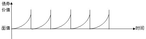 折價發行的債券在各個付息時點上的價值的趨勢是逐漸上升的,但是在兩個付息日之間是逐漸上升的,原理與平價發行債券類似。如下圖: