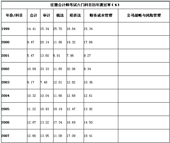 首先來看一下1999年到2010年注冊會計師考試六門科目歷年通過率: