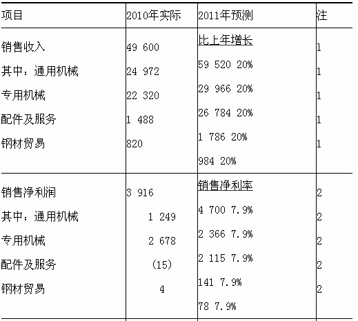 (1)①銷售收入(或銷售增長率)的預(yù)測存在錯誤。銷售收入雖然總額預(yù)期增長20%,但各業(yè)務(wù)板塊的銷售增長率應(yīng)該是不同的,而不應(yīng)都是20%的增長。小王應(yīng)當按照各業(yè)務(wù)板塊的具體情況來預(yù)測它們各自的銷售增長,比如通用機械板塊增長率較低而專用機械板塊的增長率則較高。