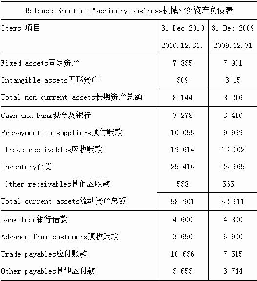 7. Based on the financial information of the machinery business (Table 5-1, Table 5-2, Table 5-3 and Table 5-4) and the description of business arrangements(Table 5-5) provided by H Group in the due diligence data room, (1) identify the three balance sheet items that had significant (over 20%) fluctuation and calculate the percentage of each fluctuation;(2) calculate the turnover days of trade receivables and inventory for both 2009 and 2010 with their year-end balances and the corresponding sales and cost amounts; (3) draft a list of questions to H Group regarding (i) the significant fluctuations in balance sheet items and (ii) the inconsistencies between the financial data (Table 5-2,Table 5-3 and Table 5-4) and the description of typical business arrangements (Table 5-5). (注:第(2)小題中一年按365天計算,答案四舍五入至整天。準備第(3)小題要求的問題清單時,應(yīng)先指出有關(guān)的重大波動及信息不一致的情況,然后提出問題。)
