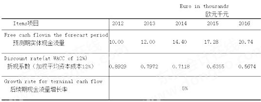 201 2年初,L集團與H集團的談判仍在進行中。此時,某投行聽說L集團有意尋求收購歐洲的機械制造企業(yè),便找到L集團在歐洲的投資顧問B先生(一位英國人),向其推薦了Y公司,并提供了下列現(xiàn)金流量預(yù)測以及估值數(shù)據(jù),供L集團參考。Y公司為一家上市公司,截至2011年12月30日Y公司收盤股價15歐元/股,總股數(shù)為1千萬股。2011年末凈負債為3千萬歐元。
