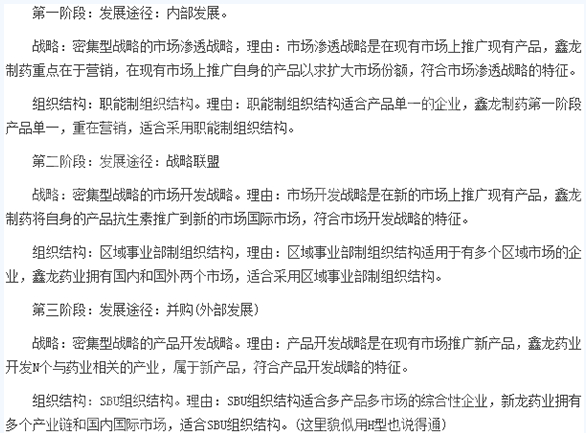 三、鑫龍制藥的三個發展階段實現途徑是什么?各自適用密集型戰略中的何種細分戰略,理由?各自適用的組織結構類型是什么,理由。