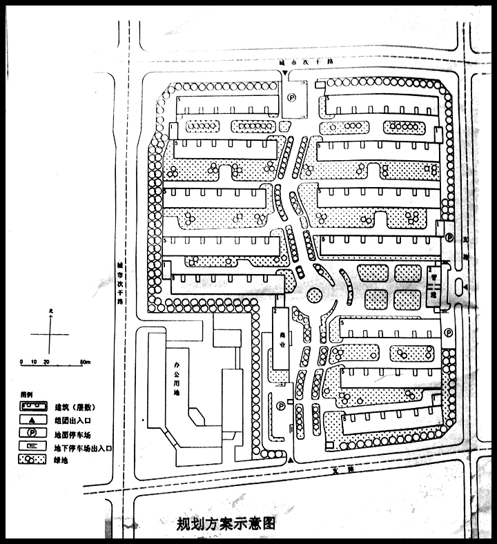 圖為某市一個居住區組團規劃方案,規劃用地9平方米,規劃住宅戶數800戶,人口約3000人.該地塊西,北臨城市次干路,東南兩側為支路,在地塊外西南角為現狀行政辦公用地,根據當地規劃條件要求,住宅建筑均為5層,層高2.8米,日照系數不少于1.4.該規劃方案布置了12幢住宅樓及物流管理和商業建筑;結合組團出入口安排地面和地下停車場,并有市政工程和環衛設施配套.