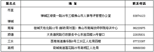 按工作屬地原則,市直和禪城區(qū)單位報名確認地點在市人事考評管理辦公室,各區(qū)報名確認地點在各區(qū)人力資源和社會保障局(詳細地址和聯(lián)系電話見附件2)。各區(qū)考生或單位(集體報名)持規(guī)定要求的“報考材料”到相應各區(qū)報名點進行“報名確認”,完成報名手續(xù)。