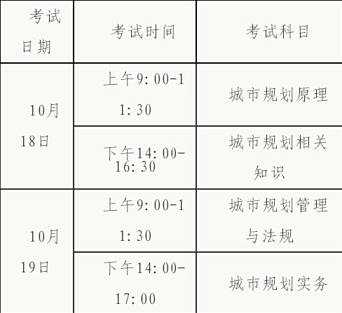 2014年度注冊城市規(guī)劃師執(zhí)業(yè)資格考試定于10月18、19日舉行,設《城市規(guī)劃原理》(客觀題)、《城市規(guī)劃相關知識》(客觀題)、《城市規(guī)劃管理與法規(guī)》(客觀題)、《城市規(guī)劃實務》(主觀題)4個科目。具體考試時間如下: