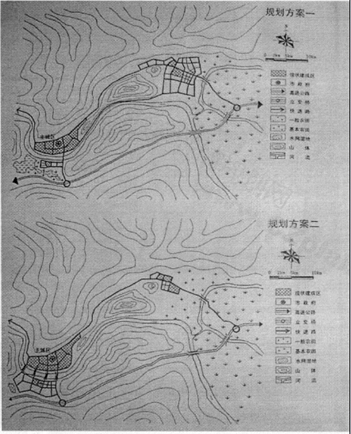 為了引導(dǎo)城鎮(zhèn)建設(shè)的有序發(fā)展,市政府開展了心一輪總體規(guī)劃,針對城市拓展方向提出了兩個(gè)比選方案(如圖)