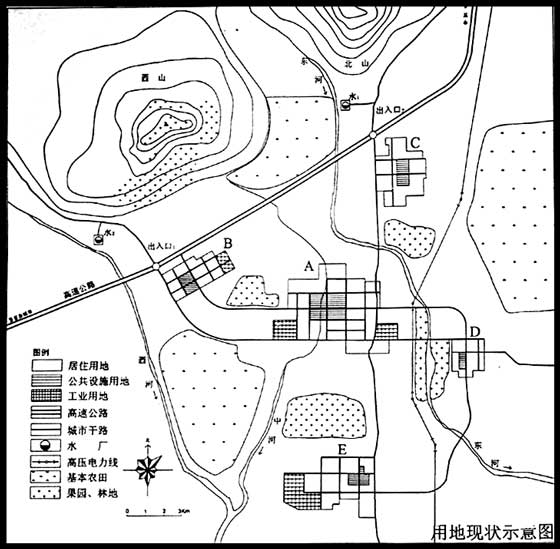 某地級(jí)市總體規(guī)劃確定,主城區(qū)在現(xiàn)狀基礎(chǔ)上仍分為5個(gè)組團(tuán),該市地勢(shì)西北高,東南低,有3條河流,主導(dǎo)風(fēng)向東北風(fēng),主城區(qū)現(xiàn)狀常住人口60萬(wàn)人,規(guī)劃為90萬(wàn)人(見(jiàn)現(xiàn)狀圖和規(guī)劃示意圖)