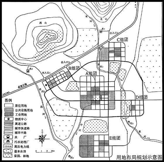 4.工業(yè)布局:規(guī)劃4處工業(yè)區(qū),在A組團(tuán)安排機(jī)械制造和生物制藥園區(qū):C組團(tuán)安排新型建材及水泥廠,E組團(tuán)為電子信息高新技術(shù)園區(qū),B組團(tuán)安排物流中心.